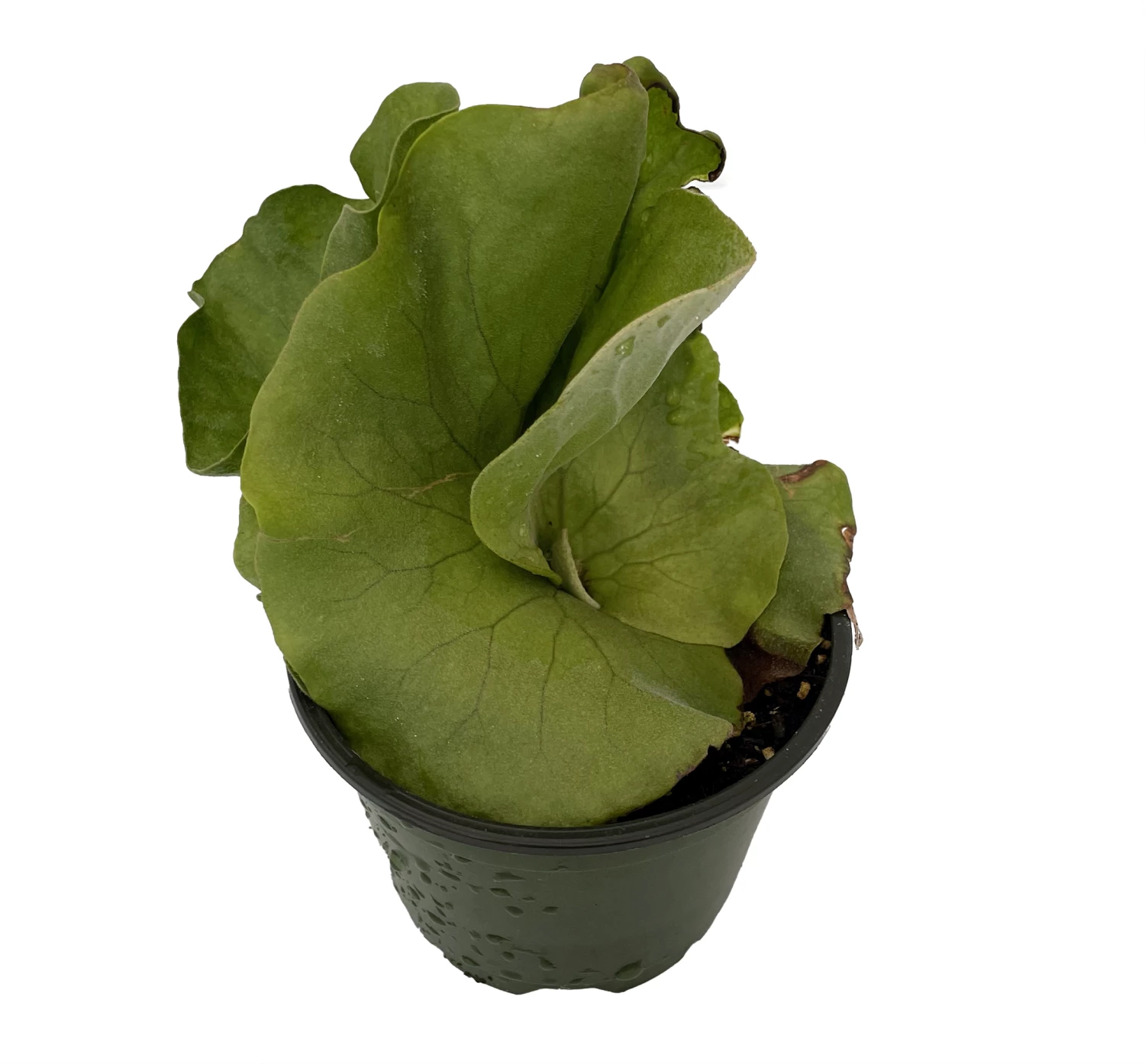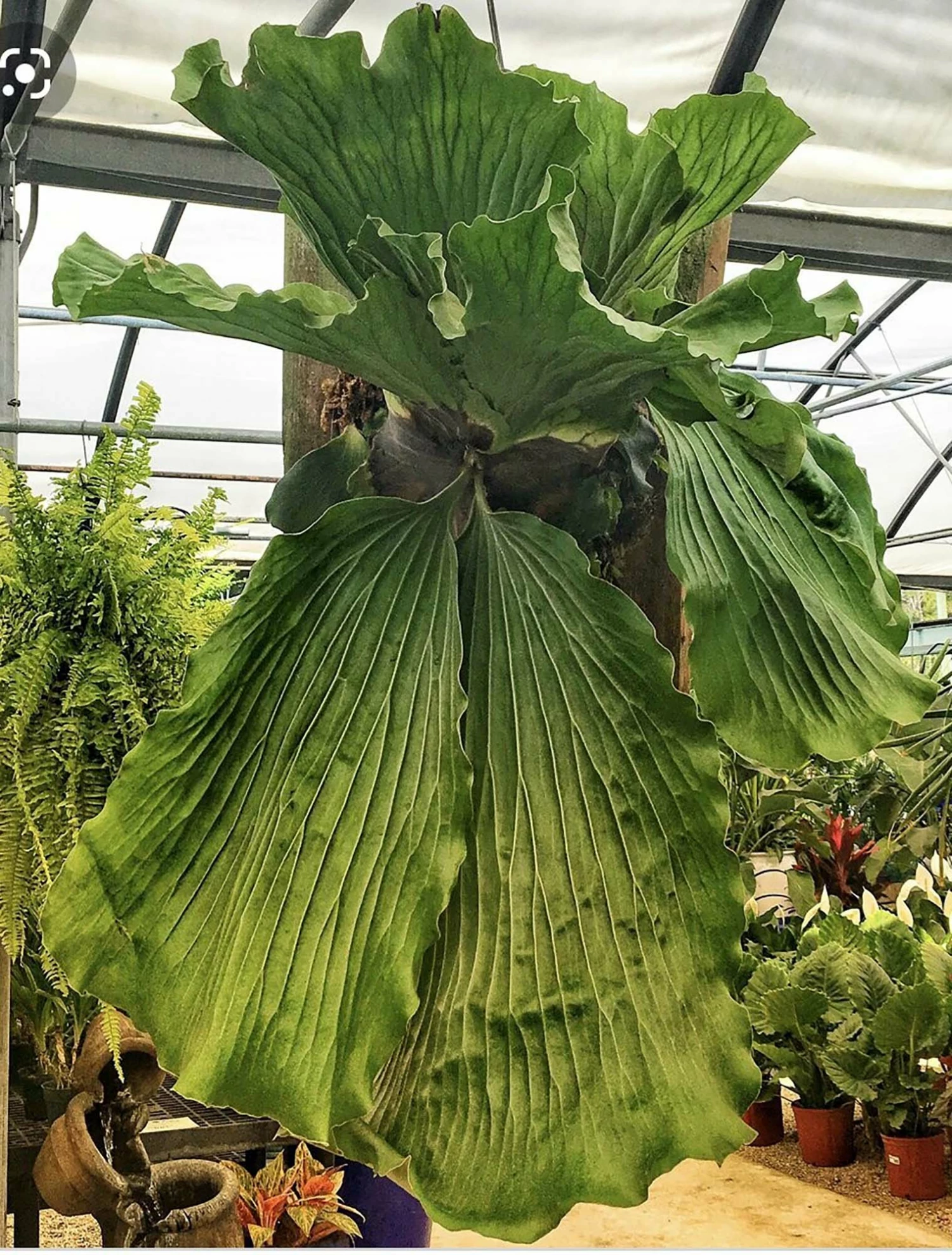 Unlike other Platycerium species, the fronds of P. elephantotis do not fork at all, giving them a very rounded appearance. Tall arching sterile fronds, and deeply veined broad round fertile fronds make this rare fern stand out from the crowd. Its common name is the elephant ear staghorn, and it really does look like a pair of ridiculously large ears. Ideal temperatures are between 60 degrees and 80 degrees. It prefers bright, but indirect light. Keep evenly moist, not wet or dry. This species likes high humidity. Fertilize with dilute (half strength) orchid fertilizer, once a month during the spring and summer. This fern, prefers to be mounted on a sphagnum covered wood plaque. Propagation is by spore, or division.