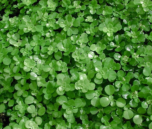 Pilea depressa is a good choice for a hanging basket, terrarium, or small pot. Rounded medium green tiny leaves adorn this low trailing indoor plant. It prefers bright, indirect light and water when on the dry side. Trim as needed. Feed once a month, spring through fall with a general purpose houseplant food following the directions on the package. Excellent for terrariums or fairy gardens.