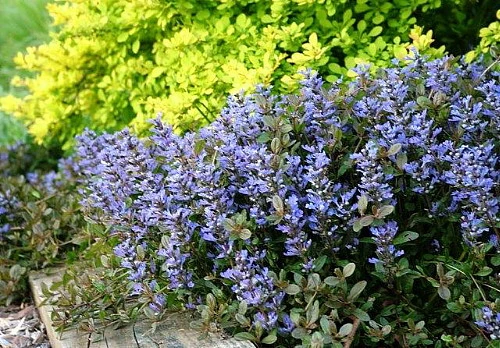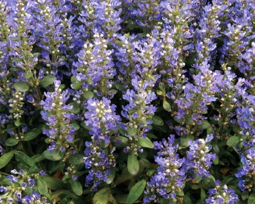 Ajuga are an extremely hardy groundcover. Lush waxy foliage hugs the soil with flowers appearing in May and June. Can be walked on, mowed over, and generally abused. In fall, blowing autumn leaves are easily raked off its dense foliage.