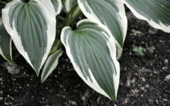 This dazzling new hybrid makes a 3′ wide clump of pointed, deeply veined, dark green foliage surrounded by a dramatic, wide, creamy white border. In midsummer, the clump is topped with 2′ scapes of lavender flowers.
