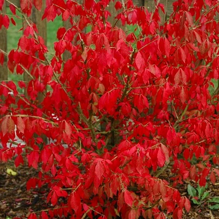 An improved selection of compact burning bush with tighter branching and superior hardiness. Burning bushes derive their common name from their bright red fall foliage color, reference to Moses’ burning bush experience. Other varieties of burning bush may experience die-back during harsh winters; Fire Ball has had no winter damage even in the coldest of midwestern winters. Fire Ball has the brilliant red fall color to be expected of burning bush. Plant it among spring and summer flowering shrubs for a jolt of color in the fall. This slightly more compact habit makes it a better fit in the landscape than other varieties, which may reach up to 10 feet in height. Fire Ball burning bush will only get about 7 feet tall.
