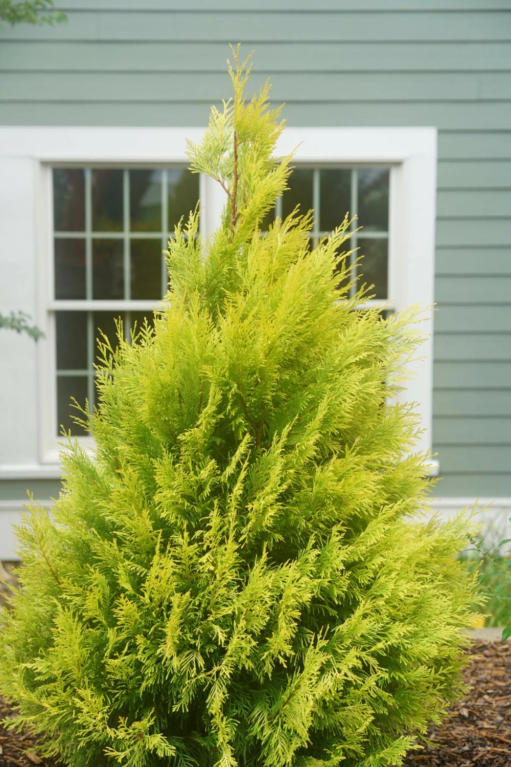 (Arborvitae) Looking for evergreens that are soft to the touch? Thuja Fluffy™is just that plant. Standing 5-10 foot tall and 2-3 foot wide, Thuja Fluffy™ is a fast growing Arborvitae that forms a nice tight pyramidal shape. The golden green foliage has proven excellent burn resistance and will add contrast to the typical greens in the garden and landscape. This upright evergreen will add interest to your garden in any season. Planted in full sun to part shade locations, Thuja Fluffy™ prefers moist well drained soils. Hardy in zones 5-8, Fluffy™ has shown to be more deer resistant than T. occidentalis. This native Arborvitae is a nice selection for hedges, borders, and specimen plantings were a soft, narrow evergreen is prefered. Although trimming Thuja is generally not needed, if you desire it may be done in early spring. Thuja Fluffy™ a Proven Winners® ColorChoice® Flowering Shrub.