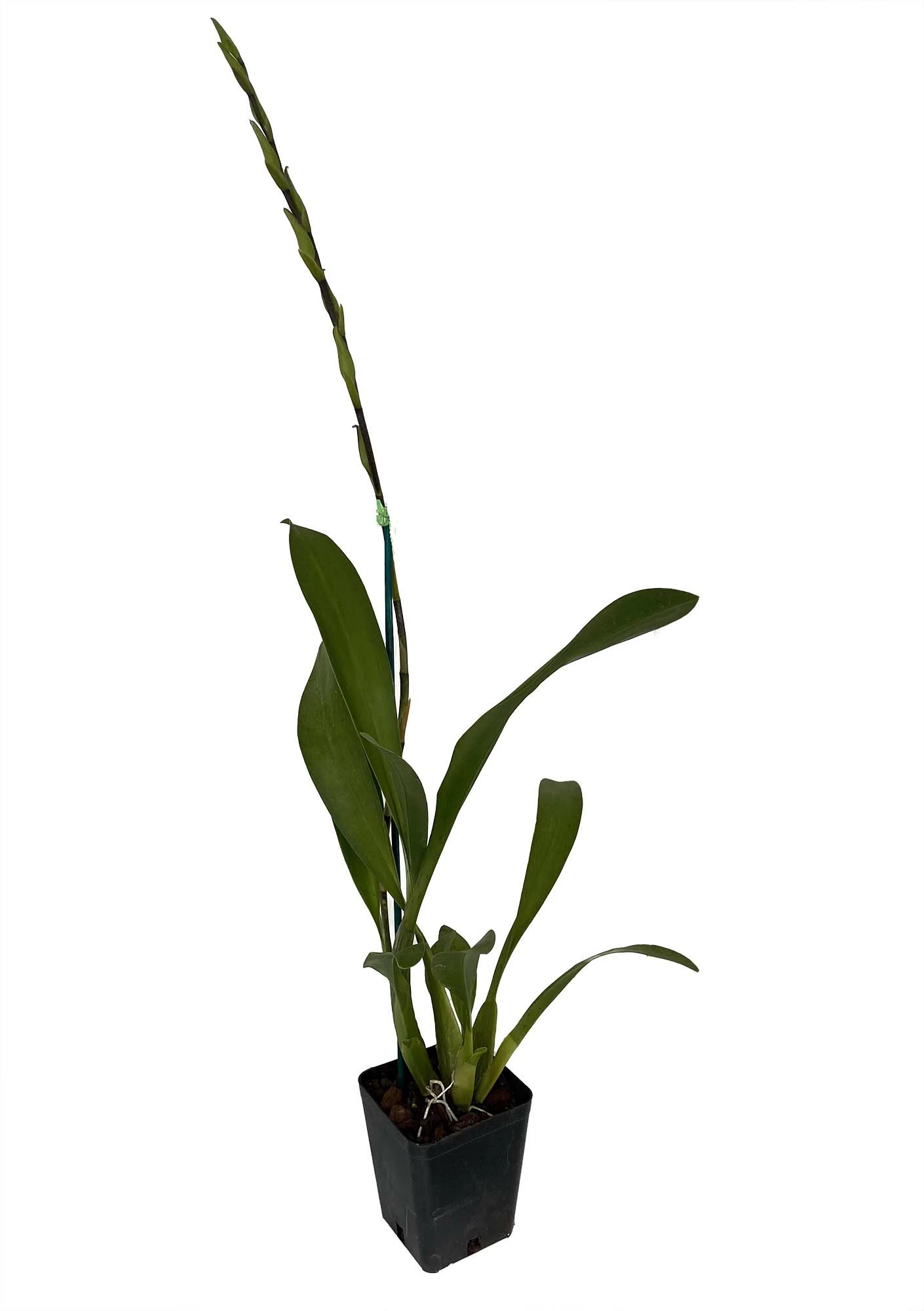 A mericlone of one of the best intergeneric Oncidium hybrids. These plants get very tall flower spikes and produce 7 to 12 flowers per spike on average. Very large, deep grape-purple colored flowers make for a showy plant. The flowers measure at about 5 inches across. Beautiful plants! Grow in cool, intermediate, or warm temps, allowing the potting mix to approach dryness between watering. Prefers medium light levels. Purplish colors in the leaves and pseudobulbs are normal for this plant.