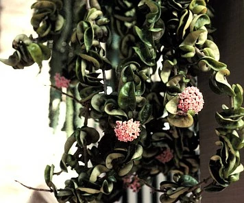 The Hindu Rope Plant is an exotic house plant native to the far east. It is rather easy to grow and can reach lengths of over 8 feet! The plant is easy to grow. It does best in a filtered light window and watered when dry. The plant prefers to be pot bound. The plant has thick, convoluted, dark green leaves, arranged on trailing, twisted stems. Small, white, waxy flowers have red centers and are very fragrant. It is related to the Wax Plant. Proper name: Hoya carnosa compacta.