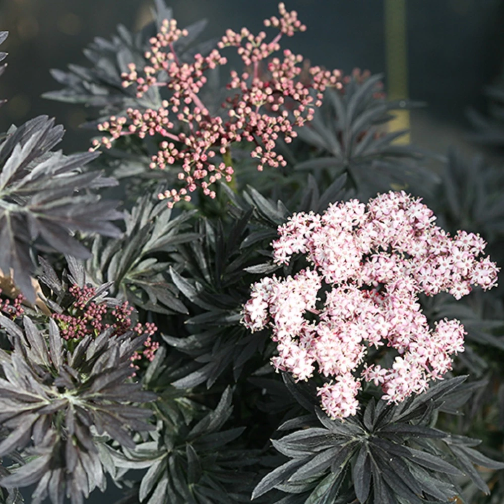 You’ve never seen an elderberry like Strait-Laced™ before: it combines a striking fastigiate habit with lacy, near-black foliage. The effect is something like a flock of birds taking flight. Pink flowers in early summer turn to black fruit if a pollinator (like Black Lace or Black Beauty elderberry) is planted nearby.