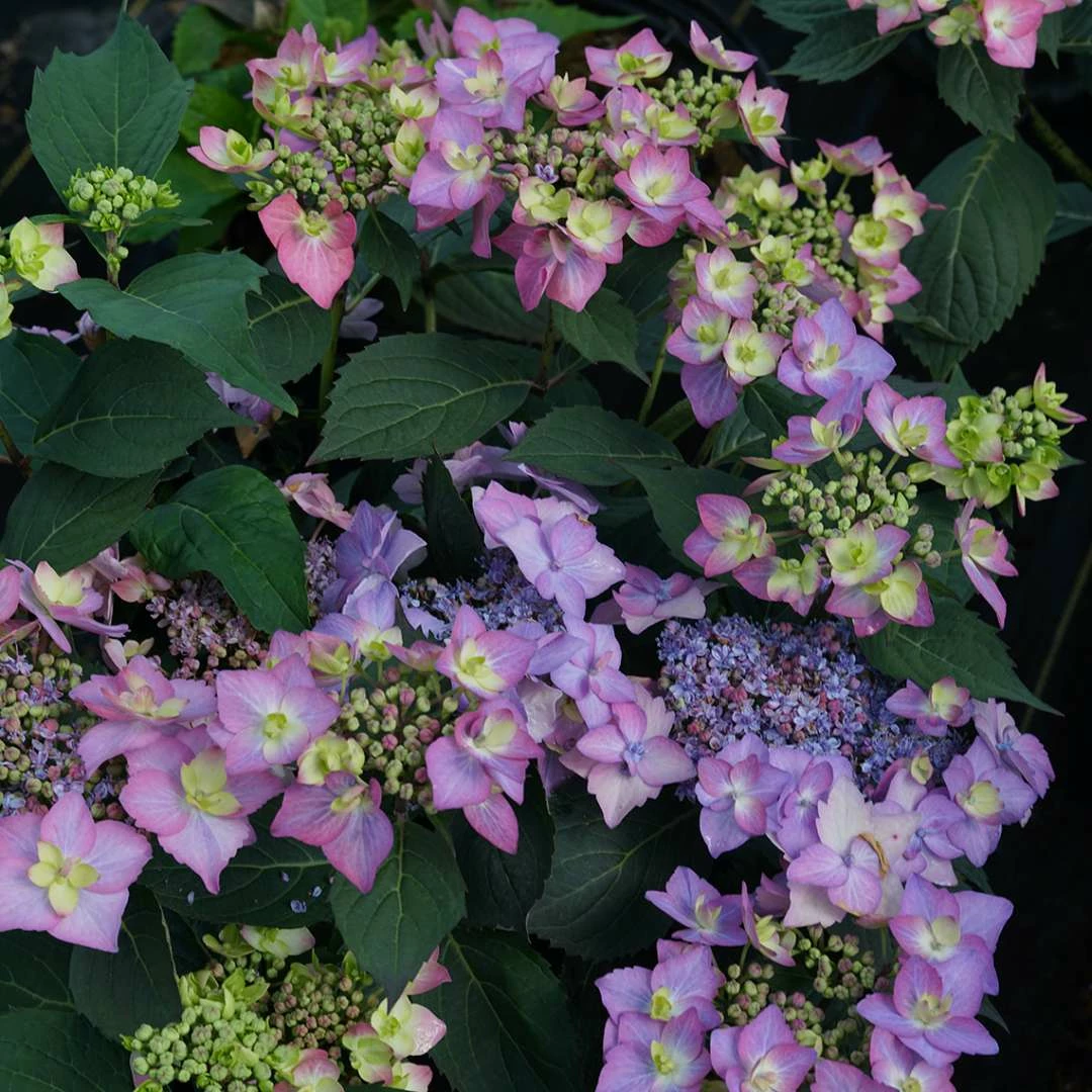 Let’s Dance Can Do! hydrangea (H. serrata) is an excellent rebloomer, requiring only a short period of vegetative growth in order to create new wood blooms. However, it has another trick up its sleeve: it sets its flower buds along the entire length of the stem, not merely at the tips. This means that if this hydrangea is cut back, or damaged by cold temperatures, those lower old wood buds will still develop into flowers. It’s a huge leap forward in achieving success with hydrangeas for landscapers, home gardeners, growers, and retailers alike. Abundant, semi-double, star-like florets make the lacecap flowers very showy.