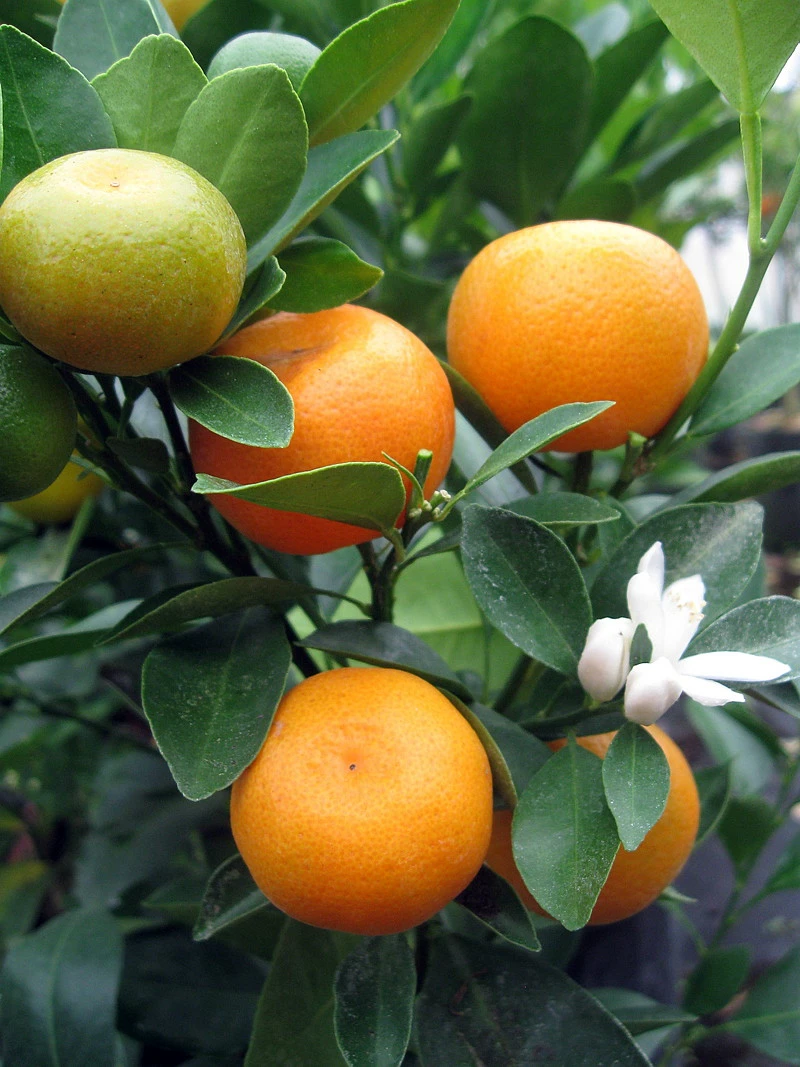 Calamondin. Citrus mitis a.k.a. Panama orange, Scarlet lime, Golden lime. Small citrus fruit resembling a miniature tangerine. Fruits are very juicy, with a sweet but acidic flavor. Common in tropical zones, but lesser known elsewhere. Easy to grow. Bears 2″ orange fruits which are sour – like lemon. Aside from being an attractive ornamental tree its fruits make excellent preserves and the juice is a great lemon substitute. Mature height is 6′ and it may be pruned. A willing indoor grower with bright light. The tree is a heavy producer of fruit and its masses of small white blossoms are intensely fragrant and flowering much of the year. Leaves are smaller than most citrus. The calamondin is hardy to temperatures in the mid 20’s. It can be successfully grown outside throughout California, Florida, and the gulf coast. It makes an excellent house plant or patio plant in colder areas. Propagation: Often by seed, (unlike many other citrus). Seeds are polyembryonic and may produce up to 3-5 seedlings each. Eaten raw, although the flavor is very acidic. Often used to flavor drinks, jellies, and a variety of foods. Native to China. Has now spread throughout much of the South Pacific and the Americas. Grow on the patio or indoors. Loves the sun.