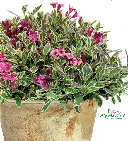 Just 12 to 18 inches high and wide, My Monet forms a plump, tight little footstool-shaped plant, magnificently blushed with pink in leaf and bloom. The new spring foliage is bright pink, maturing to green edged in white, and the abundant rosy purple-pink blossoms are far larger and more abundant than on other varieties.