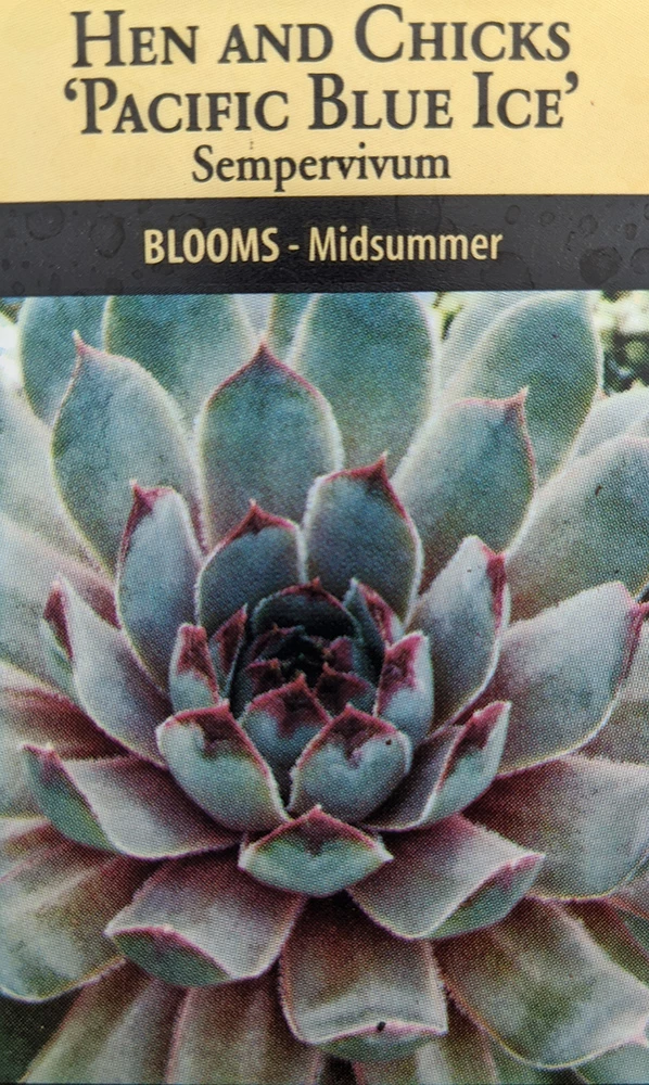 An attractive addition for a rockery, crevices, trough gardens, containers or raised beds, ‘Pacific Blue Ice’ has steel blue foliage in summer but takes on burgundy tints with cooler temperatures. Many offsets or chicks are produced off the 4″ mother hen rosette. Plants grow only 3-4″ tall, and the width depends on how many offsets you get. super Hardy and deer resistant. Pictures here is its winter color.