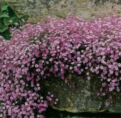 Creeping Pink Babies Breath (Gypsophila repens ‘Rosea’). A delightful plant for cascading down rock gardens, walls and dry banks, its greyish leaves are covered by a froth of small pink flowers in summer. It is happy in sandy or stony soils, but does best in deep well-drained soil. Plant in full sun, 12 inches apart. Grows only 6″ tall. A very hardy perennial! Hardy in zones: 4-9. Proper name: Gypsophila repens rosea