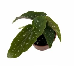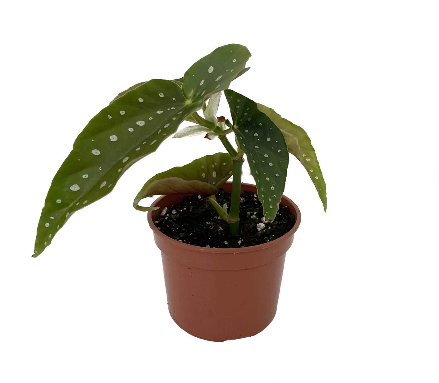 Festive, cheerful innocence describes this fancy begonia nicknamed “Polka Dot.” Large, dramatic silver spots and matching light pink flowers are some of the best features. Another feature worth sharing is that this stunning bat-winged begonia is suited for basket culture or upright pots and is a vigorous grower.