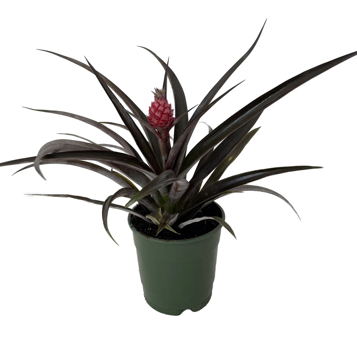Red pineapples are generally smaller than common commercial pineapples and grow on a thick stem that is nestled among curved, elongated, and pointed leaves. The oblong to cylindrical fruit has a waxy, fibrous skin that is covered in downward-facing, red-pink spines, and the fruit connects to a leafy and spiked, variegated green-red crown. Underneath the tough skin, the flesh contains hues of white, yellow, and pink, and is dense and somewhat chewy, encasing a hard, central core. Depending on the climate the fruit is grown in, the flesh can be juicy with a sweet and slightly tangy taste and may or may not contain seeds. Though the plants are mainly considered to be ornamental, in tropical climates with a high amount of rainfall, Red pineapples are edible and are consumed fresh or juiced. Red pineapples are edible but will vary in texture and flavor depending on the climate and amount of water the plant has received during the growing process. The fruit will keep up to five days when stored whole and upside-down to allow sugars to redistribute from base to crown in the refrigerator. Sliced pieces of fruit will keep 1-3 days when stored in a sealed container in the refrigerator. Today Red pineapples are not commercially grown on a large scale and are predominately found as a specialty, ornamental variety in home gardens.