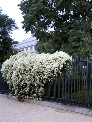 Clematis paniculata. The beautiful sweet autumn clematis is a vigorous semievergreen (or deciduous) vine than can climb up to 30 feet. The compound leaves are glossy and deep green. The star shaped white flowers are about an inch and a quarter across and sweetly fragrant. They are borne in numerous branching panicles from late summer through autumn. Vines can be so laden with billowy masses of white flowers that they look like they’re covered with snow! The seed heads are pretty, too, with their silvery-gray feather-like styles. There is an old saying with Clematis; “Tops in the sun and feet in the shade.” In other words the vine blooms best in the sun and benefits from a cluster of small plants, planted around the base of the plant. Many people simply plant a ground cover like ivy, myrtle, or pachysandra around the plant to shade the base. Clematis does best in fertile, humus rich, well-drained soil. Mulch well with composted manure or compost. Feed once a month with a well balanced fertilizer during the growing season.