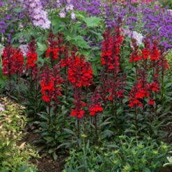 Fiery cardinal-red flower spikes bloom on strong stems over deep purple foliage on full, well branched plants, making this a truly outstanding perennial selection. Blooming from late summer into fall, this native plant features tubular flowers that are irresistible to hummingbirds and butterflies. Grows well in wet soils, at the edge of a pond or stream, in the border or containers, and is particularly effective when massed.