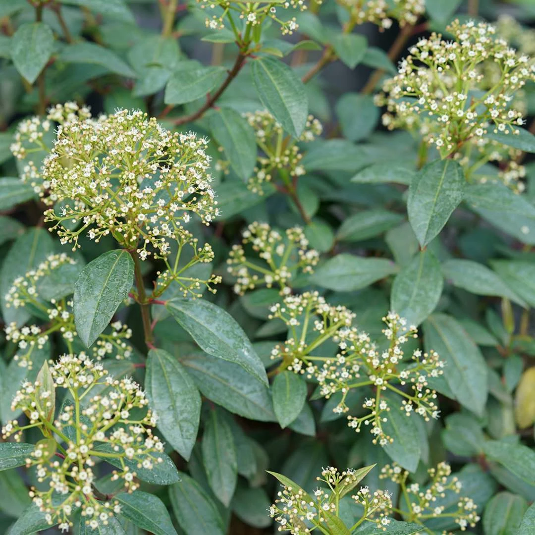 Developed by Dr. Tom Ranney at NCSU, Yang viburnum is an elegant, compact evergreen hybrid (V. davidii x V. propinquum) that has thick, glossy, bluish-green leaves and showy round clusters of white spring flowers. The flowers are followed by elliptical blue fruit if pollinated by Yin™ viburnum.